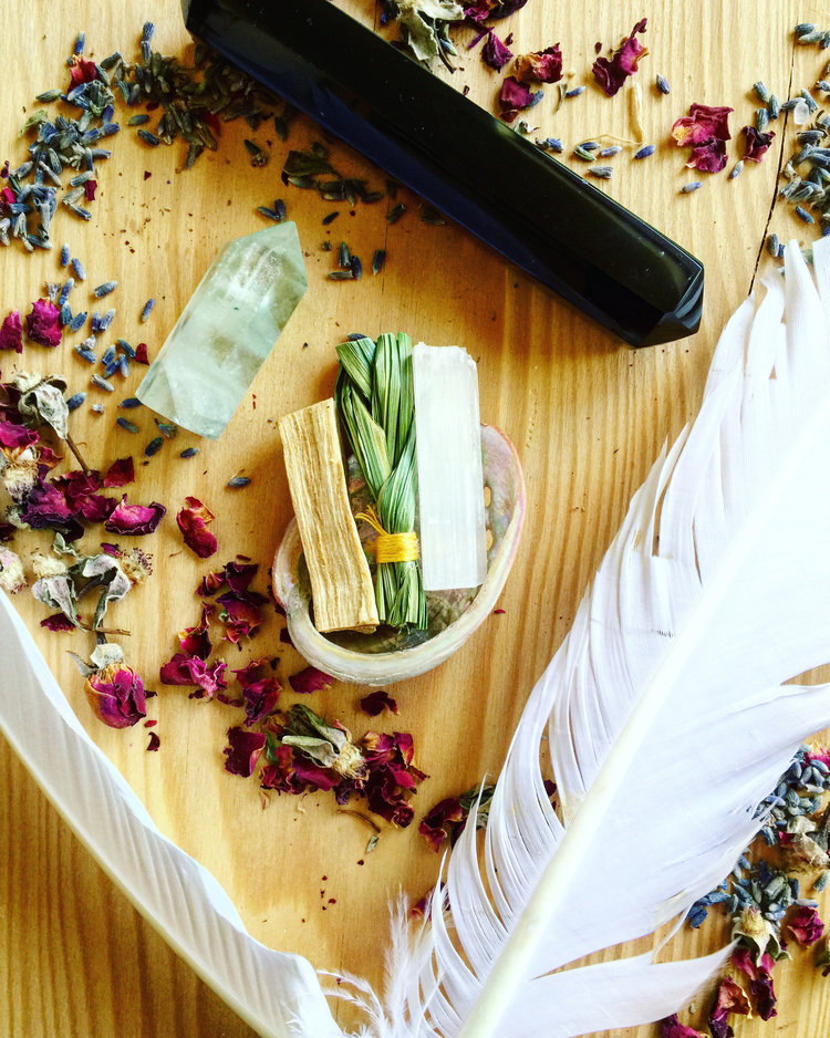 Small selenite wand, palo santo, and sweetgrass bundle nestled in a pink abalone shell is the perfect way to smudge while out and about. Stick it in your purse or pocket to use right when you need it. This teeny smudge kit is great for a small thoughtful gift or to add on to a larger gift to complete your thoughtful wishes.