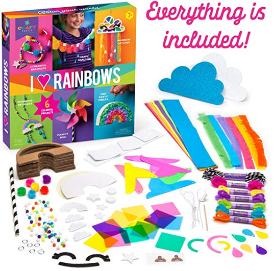 Chase the clouds away with the Craft-tastic I Love Rainbows craft kit from Ann Williams Group. This on-trend collection of rainbow crafts includes everything needed to make 6 rainbow crafts. Make a pair of bracelets and a necklace to wear, or a pinata to share with friends. This set also includes brilliant wall décor perfect for adding a ray of funshine to a bedroom, and a spinny pinwheel that really shows off the colors. Detailed instructions written with young readers in mind make assembly a fun experience for crafters of all ages. We’ve collected everything needed to make all six of these brightly colored rainbow crafts in one convenient package so there are no other materials or special tools to buy.