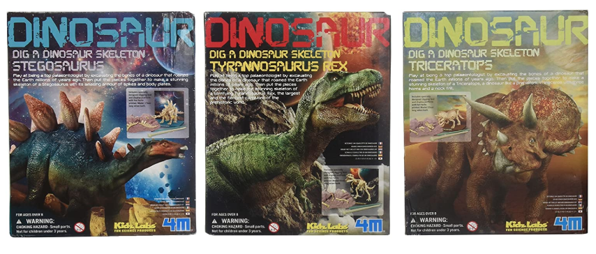 Tyrannosaurus Rex and Triceratops dinosaur dig kits. Digging tools included. Assemble excavated bones into a dinosaur skeleton.