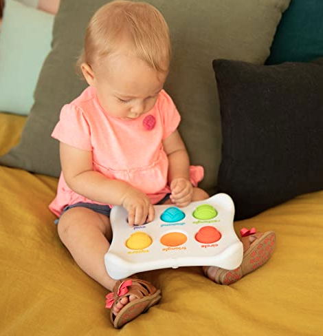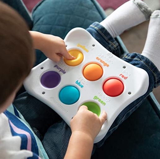 Textures, colours, shapes, and words! On one side, each silicone button is embossed with a different shape and labelled with its matching word in English and in Braille. Flip the whole thing over and this time, the buttons are smooth and the words match the colours! It’s a tactile delight to touch, push, and pop. Compact size and perfect for on-the-go. Bpa-free, made with food-grade silicone buttons, and designed just right for little hands, The dimpl duo is an ideal way to get the most out of sensory play.