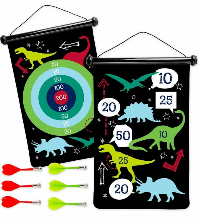 Hang this magnetic canvas dartboard from any wall or door, set your sights on the target, and shoot! With two colorful designs (one on each side), this game is double the fun. Different point systems create fun challenges and engage kids to practice their hand-eye coordination. Going on a trip? Take the game with you! The board rolls up and stores away into a sturdy tube.