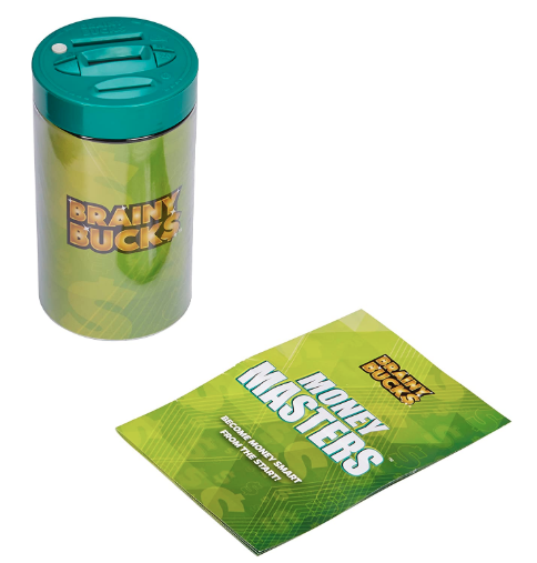 Brainy Bucks bill & coin money jar is a fun way for kids to save money! the 6.75in. Jar is clear and fully customizable, so a young entrepreneur can watch their cash pile grow, or add images of themselves, what they’re saving for or anything else that inspires them to save. The 1in. Thick electronic green lid recognizes the value of each coin as you drop them in the slot, while a currency slot lets you add bills-ones, fives, tens and Twenties. The digital display tracks the balance as it grows and balance Guard remembers the balance, even when you change batteries! the smart jar comes with a fully illustrated, educational “money Masters” booklet, which teaches kids how to be money smart from the start! requires 2 “AA” batteries (not included). includes a durable acrylic jar, and money Masters booklet. Recommended for children 5 years of age and older.