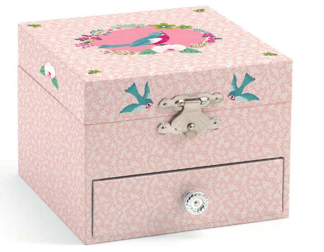 Everyone needs a place to keep their treasures, keepsakes and special stuff. These DJECO Treasure Boxes make a special gift and a wonderful dresser top decoration. Turn the handle on the back of the box and special, classic song plays. Each box has a special spinning figurine, mirror back drop, velevet lined compartments and a pull-out drawer. Beginning in France in 1954, DJECO creates award winning, timeless children’s products dedicated to quality, value and child development. With a philosophy of creativity, boldness and passion, our products are recognized as being as beautiful as they are entertaining. We believe that play is essential to a child’s intellectual growth; awakening curiosity, enriching boundless imagination and celebrating their inner brilliance. DJECO toys engage, energize and entertain. Originally focused on toys, games and puzzles, the they’ve expanded into crafts and home decor, sets designed with artistry, inspiration and a unique, hands-on aesthetic. Creating a place where kids can keep their hands in the paint, but their imaginations in the stars. We team with hundreds of internationally renowned artists who share our vison of promoting artistic discovery and freedom of imagination through play. Made from the highest quality materials with exacting and meticulous attention to detail, play value and artistry, DJECO products are revolutionizing the toy box. Engaging illustrations draw the child in, exceptional play enthralls, and the experience enhances a sense of wonder and delight. All DJECO products are child safe and completely non-toxic, meeting and exceeding all US and European testing standards.