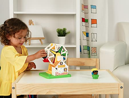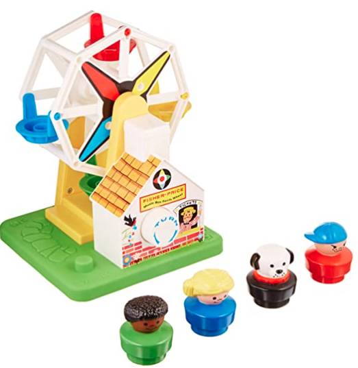 First introduced in 1966, The Fisher-Price Music Box Ferris Wheel delighted children and parents whit its whimsical music and Play Family characters. Wind the knob for the Ferris Wheel to revolve and listen to the tune, “In the Good Old Summertime”. The 4 “passengers” in the swinging bucket seats are removable. .