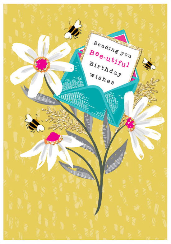 A lovely little card with a tiny little envelope and letter attached. An appealing combination of bold illustrations mixed with a pop of pink neon ink. Brilliant gold flitter detailing. Printed on FSC certified board. Each card is individually cello wrapped and includes a printed envelope.
