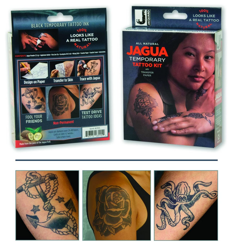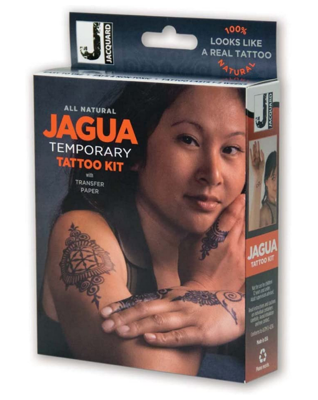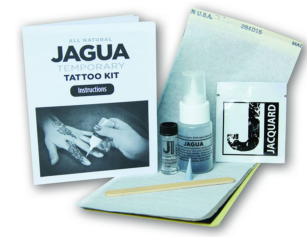 Jacquard Jagua temporary tattoo kit is the 100% natural, easy-to-use body art set crafted from pure Amazonian fruit. The bluish-black ink is temporary, body-safe, non-toxic, and can last up to 2 weeks. It’s easy: just draw your design on the transfer paper using a pen, pencil, or stylus, and use the transfer cream to press your art onto your skin. Then trace! Apply more or less jagua ink to achieve darker and lighter lines, tones, gradients, and shades. Use jagua to express yourself, fool your friends, or test-drive your next permanent ink! .