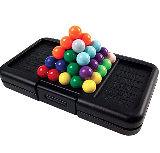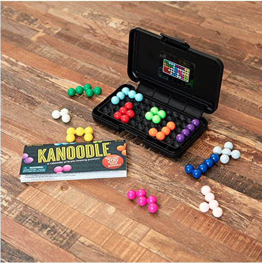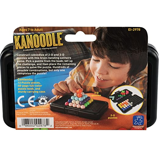 Can you Kanoodle? Using combinations of colored connected beads, players complete colorful logic puzzles in two unique formats: tricky 2D puzzles and twisted 3D pyramids. To start, pick a design from the puzzle book, place some of the puzzle pieces into position as shown…then fill the empty spaces with the remaining pieces. Sounds simple? It can be…or it can be deviously difficult, depending on the level of game play. Hundreds of possible combinations, but only one completes the puzzle. Puzzle pieces fit inside the handy pocket-sized case with built-in game boards, so you can Kanoodle anywhere. Includes 12 puzzle pieces, 48-page illustrated puzzle book, and carrying case. For 1 player.