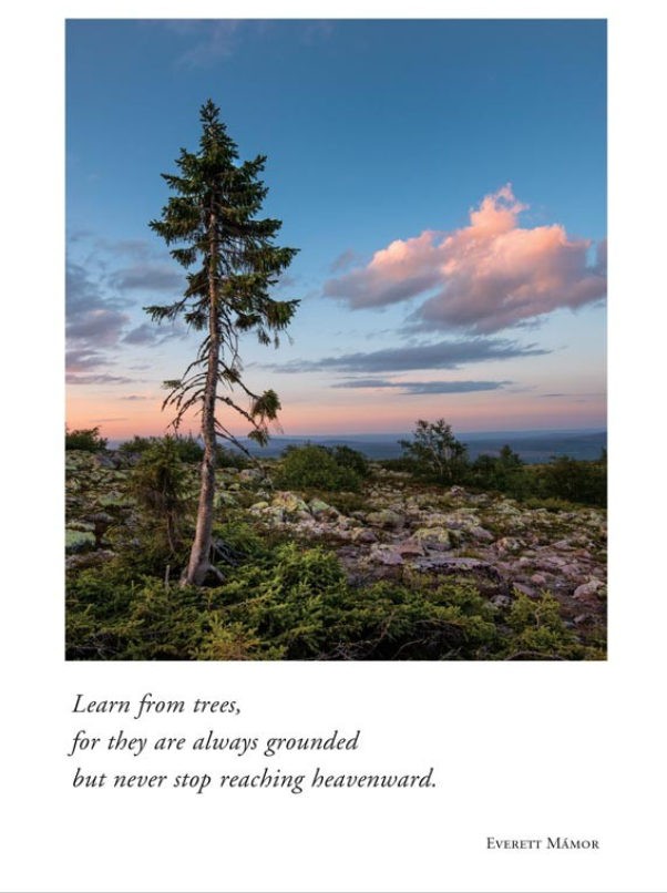 Front: Learn from trees, for they are always grounded but never stop reaching heavenward.