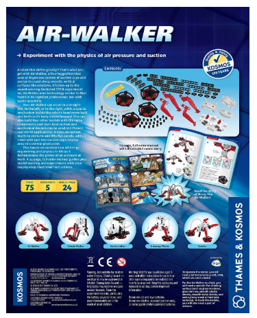 That’s what you get with Air-Walker, a four-legged bot that uses an ingenious system of suction cups and pumps to crawl along smooth, vertical surfaces like windows. A follow-up to the award-winning Geckobot STEM experiment kit, Air-Walker uses technology similar to that found in its reptilian predecessor, but with easier assembly. You can also build four other models with the same components and learn how suction and mechanical devices can be used in different real-world applications.
