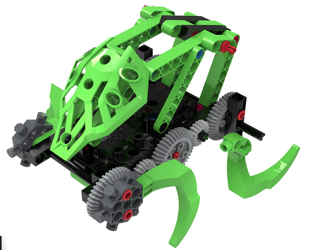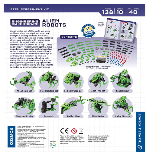 Construct ten out-of-this-world machines and learn about the physics of levers and linkages. A battery-powered motor box powers the models. Make a creepy slithering alien snake-bot model with rotating arms and articulating tail. Build an alien insectoid-bot that crawls on six legs. Create an alien Raptor model with wings that move up and down. Assemble a cool grabber claw with a scissors mechanism. Make a bipedal alien robot model that walks on two legs. In addition, build models of a pump Jack, swinging device, hopping alien frog-bot, roving dyno-bot with reciprocating arm, and rolling alien dragon-bot. A 28-page manual guides your model building and experiments with step-by-step illustrated instructions.