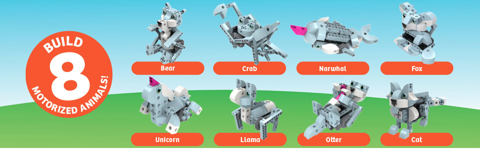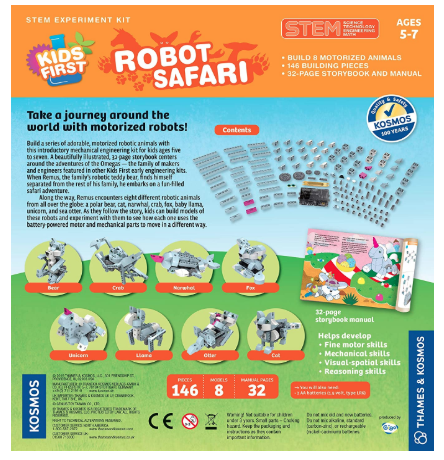 Build a series of adorable, motorized robotic animals with this introductory mechanical engineering kit for kids ages five and up. A beautifully illustrated 32-page storybook centers around the adventures of the omegas — the family of makers and engineers featured in other kids first early engineering kits. When Remus, the family’s robotic teddy bear, finds himself separated from the rest of his family, he embarks on a fun-filled safari adventure. Along the way, Remus encounters eight different robotic animals from all over the globe: A polar bear, Cat, Narwhal, crab, fox, baby llama, Unicorn, and sea Otter. As they follow the story, kids can build models of these robots and experiment with them to see how each one uses the battery-powered motor and mechanical parts to move in a different way. Large, cubic plastic building pieces make it easy for small hands to put the models together. Robot safari provides an engaging way to teach simple engineering concepts to young children, allowing parents, teachers, and caregivers to lay the groundwork for strong stem-related skills and comprehension at an early age. Model building and experiments develop fine motor skills, mechanical engineering skills, visual-spatial skills, and reasoning and concept development skills.