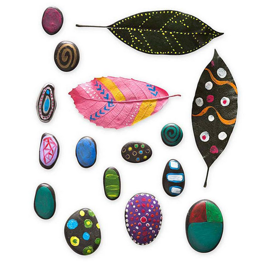 Discover a whole new way to source spectacular art supplies, and to craft some incredible art! Our set of artists’ tools consists of smooth stones, colorful leaves, and other art supplies found in nature in assorted sizes and shapes. Stones become friendly faces, and leaves become patterned wall hangings, garlands, mobiles, and more (detailed instruction/inspiration booklet included)! Our creative crafters’ kit includes 10 rocks, 12 leaves, 2 wood slices, 2 branches, 2 pinecones, small googly eyes, 2 paint pots, 12 paints, 2 brushes and a whole new way to look at art and the environment.