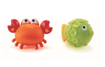 The Hape Rock Pool Squirtersare colourful and fun water play toys. This cute crab and fish have a cheeky secret If you fill them up with water and squeeze them they will shoot out water. Brings splashy fun to bath time Product Features: 2-piece set Comes apart for easy cleaning and drying. A fun little addition to any family bathroom. Age recommendation: 18m+