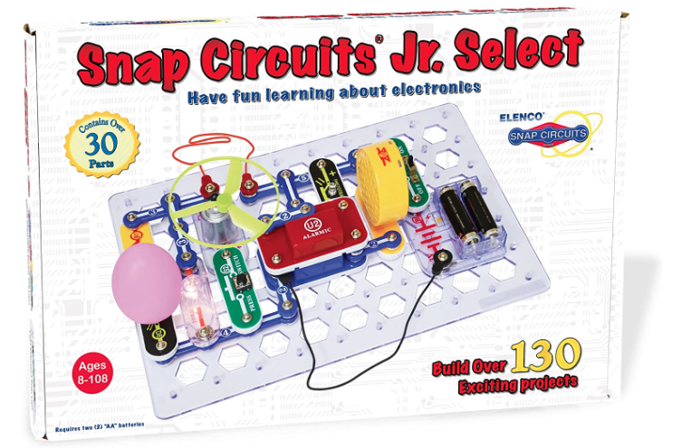 Get ready for hands-on learning fun with Snap Circuits Jr. Select! Your child will have endless fun learning to build circuits with these colorful electronic Snap Circuits. Each one features more than 30 parts that easily snap together. The Snap Circuits Jr. Select can be used to make interesting circuits, encouraging educational play that teaches your future engineer about electricity. All of the parts have colored graphics that represent their Real electronic names and symbols. This educational toy comes with a complete instruction manual and project guide that helps you to guide your child through exploring over 130 experiments. Some of the projects include glow-in-the-dark flying propeller, phototransistor, LEDs, resistors, ICs, a DC motor and much more!