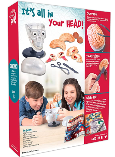 Build a brain and then pick it apart with this sequel to our best-seller—the Squishy Human Body. This anatomically correct model, complete with moving mandible (jawbone) and squishy plastic brain and eyes, makes for a realistic experience of our body’s gray matter. If you think about it, it’s really a no brainer! Read all about it! Kids get ahead of the pack by taking them on a tour through the sense, movement, memory, emotion, decision-making, and automatic functions like breathing and digestion. Phenomena like brain freeze and notes on how and when things go wrong are also explored. Fun activities, too! Includes: • 9-piece transparent skill that fits together at the sutures • 8 squishy brain parts • Squishy eyeballs • 4 vertebrae pieces with spinal cord • Skull base • Tools: forceps, scalpel, and tweezers • Skull map • Brain blister with labels • 32-page, fully illustrated book SmartLab Toys manufactures toy-plus-book products that entertain and educate through hands-on exploration for children ages 4-12