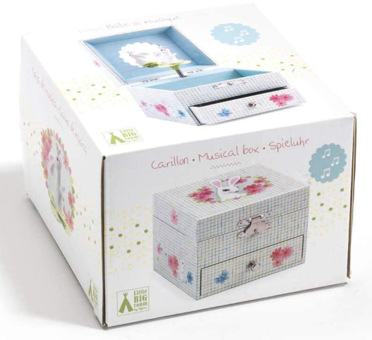 Everyone needs a place to keep their treasures, keepsakes and special stuff. These DJECO Treasure Boxes make a special gift and a wonderful dresser top decoration. Turn the handle on the back of the box and special, classic song plays. Each box has a special spinning figurine, mirror back drop, velevet lined compartments and a pull-out drawer. Beginning in France in 1954, DJECO creates award winning, timeless children’s products dedicated to quality, value and child development. With a philosophy of creativity, boldness and passion, our products are recognized as being as beautiful as they are entertaining. We believe that play is essential to a child’s intellectual growth; awakening curiosity, enriching boundless imagination and celebrating their inner brilliance. DJECO toys engage, energize and entertain. Originally focused on toys, games and puzzles, the they’ve expanded into crafts and home decor, sets designed with artistry, inspiration and a unique, hands-on aesthetic. Creating a place where kids can keep their hands in the paint, but their imaginations in the stars. We team with hundreds of internationally renowned artists who share our vison of promoting artistic discovery and freedom of imagination through play. Made from the highest quality materials with exacting and meticulous attention to detail, play value and artistry, DJECO products are revolutionizing the toy box. Engaging illustrations draw the child in, exceptional play enthralls, and the experience enhances a sense of wonder and delight. All DJECO products are child safe and completely non-toxic, meeting and exceeding all US and European testing standards.