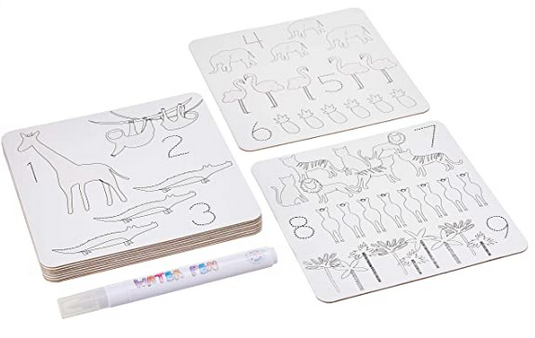 Magic Water Cards by Floss & Rock are perfect for little hands and exploration of letters, numbers, and colors. Fill the pen with water, and color in the pictures to watch designs magically appear and then disappear when dry. Can be reused again and again and stored away in the handy case.