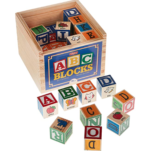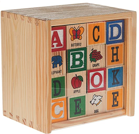 Build a tower or learn the alphabet with these colorful wooden blocks! With colorful pictures, words, letters and numbers, these blocks are full of building fun! Kids will spend hours at a time with these blocks, building, creating, and “writing.” Regular playtime with them can heighten letter, number, and object identification skills, and illustrate how placing one letter next to another and another can make a word. The cube is stamped with letters, numbers and objects. Each set contains 48 blocks and is packaged in a box with a sliding lid.